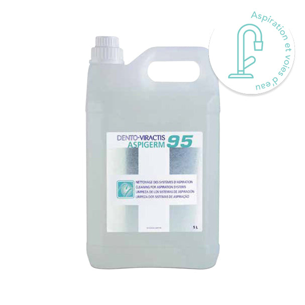 Dento-Viractis 95 Aspigerm. Nettoyant désinfectant des systèmes d’aspiration. Concentré à 0,5 % et compatible avec les différents systèmes d’aspiration.